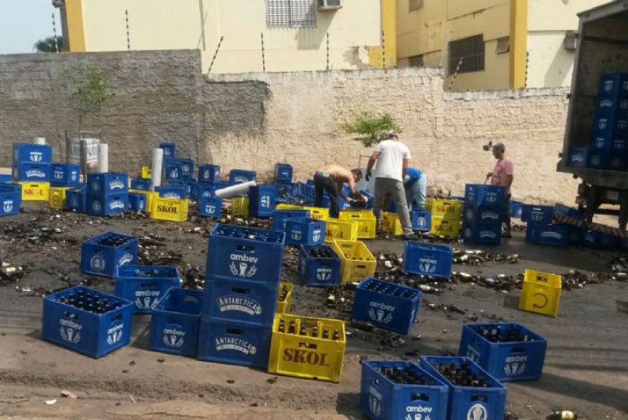 Mais de 100 caixas de garrafas de cerveja caíram de um caminhão na Avenida Presidente Marques, região central de Cuiabá, na manhã desta quarta-feira (7).