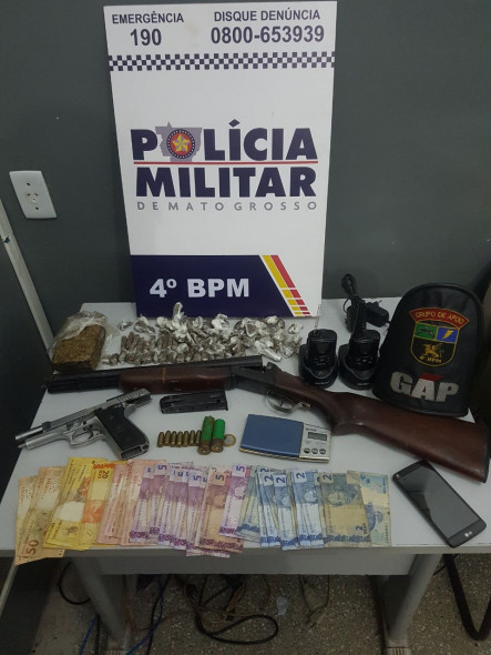 Policiais militares apreenderam uma arma de fogo e porções de drogas na noite desta terça-feira (13) em uma casa na Cohab São Matheus, em Várzea Grande.