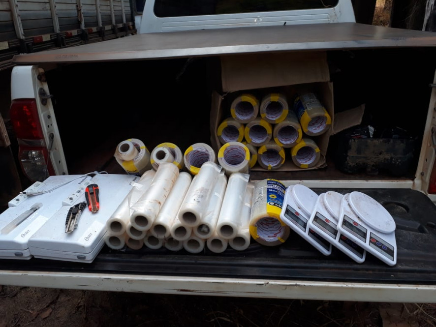 Também foram localizados vários materiais para refino e comercialização de entorpecentes, como prensa industrial, fitas, máquinas de lacrar sacola, insulfilme, arrebitadeiras e balanças de precisão.